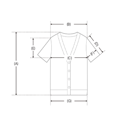 | SIZE | 총장(A) | 어깨(B) | 가슴(C) | 팔길이(D) | 암홀(E) | 팔통(F) | 밑단(G) |
