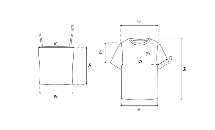 | SIZE | 총장(A) | 어깨(B) | 가슴(C) | 팔길이(D) | 암홀(E) | 팔통(F) | 밑단(G) |