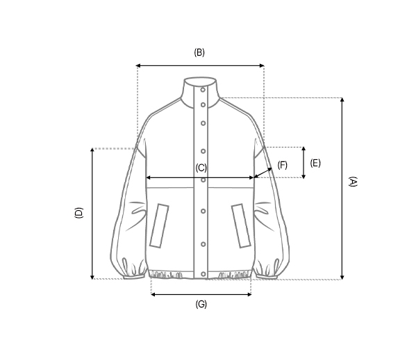 | SIZE | 총장(A) | 어깨(B) | 가슴(C) | 팔길이(D) | 암홀(E) | 팔통(F) | 밑단(G) |