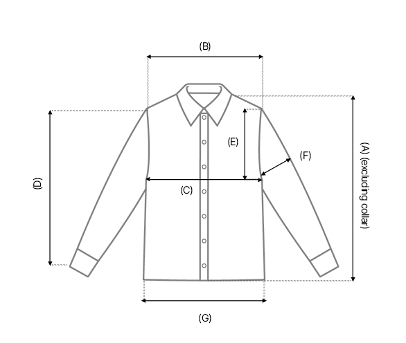 | SIZE | 총장(A) | 어깨(B) | 가슴(C) | 팔길이(D) | 암홀(E) | 팔통(F) | 밑단(G) |