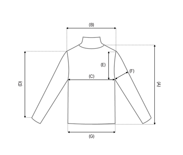| SIZE | 총장(A) | 어깨(B) | 가슴(C) | 팔길이(D) | 암홀(E) | 팔통(F) | 밑단(G) |